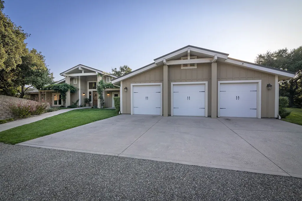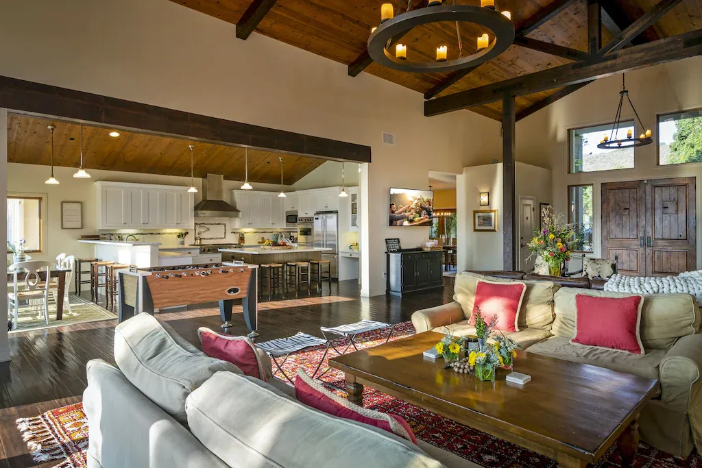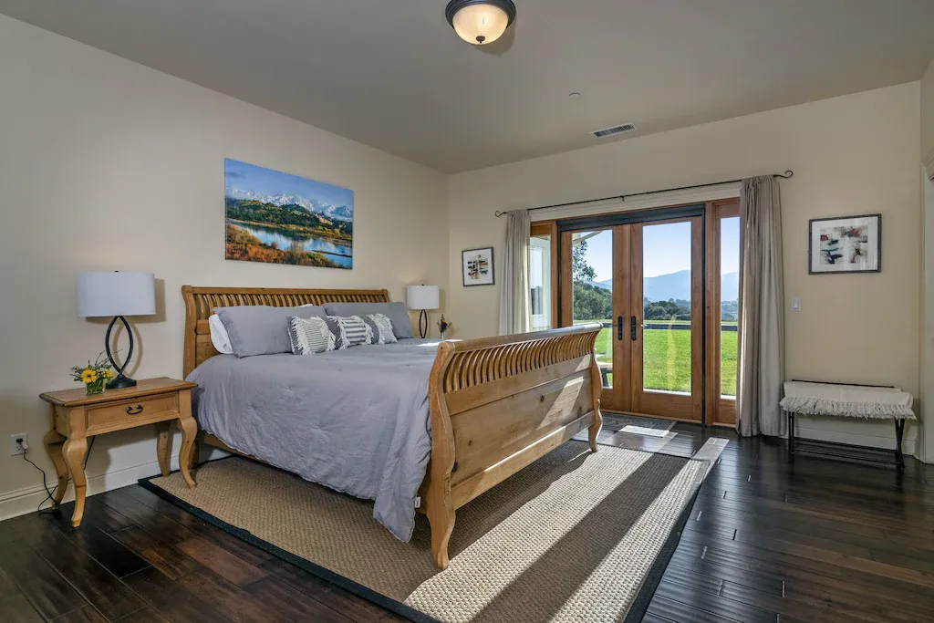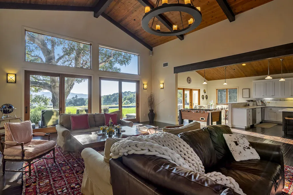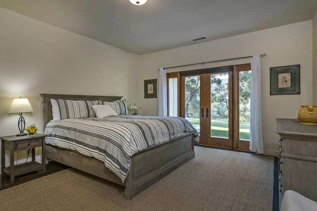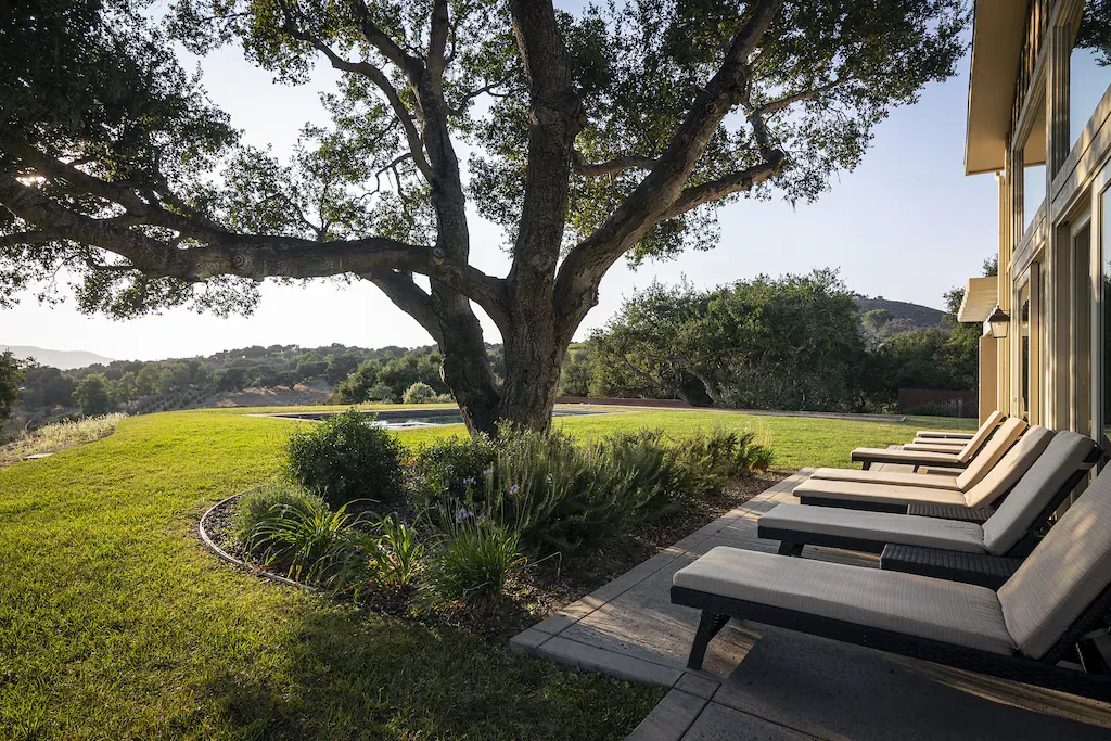 Oak Valley Ranch is nestled amongst mature oak trees and sits atop 20 magnetic acres where you and your guests will find total privacy. Shaded by a large oak tree, the back yard at Oak Valley Ranch is perfect for entertaining or simply relaxing with family and friends. Enjoy sitting around the teak wood patio table, playing Foosball, or having a go on the bocce ball court! Just a five-minute drive to town, Oak Valley Ranch is the ideal location for those guests looking to wine taste, shop, or dine.