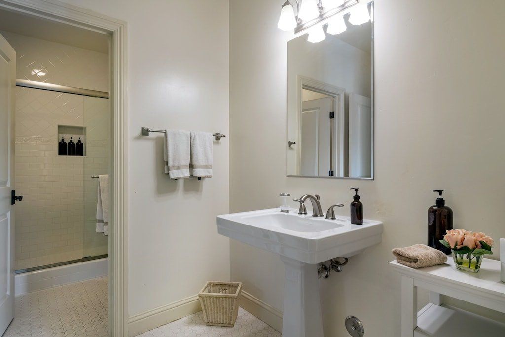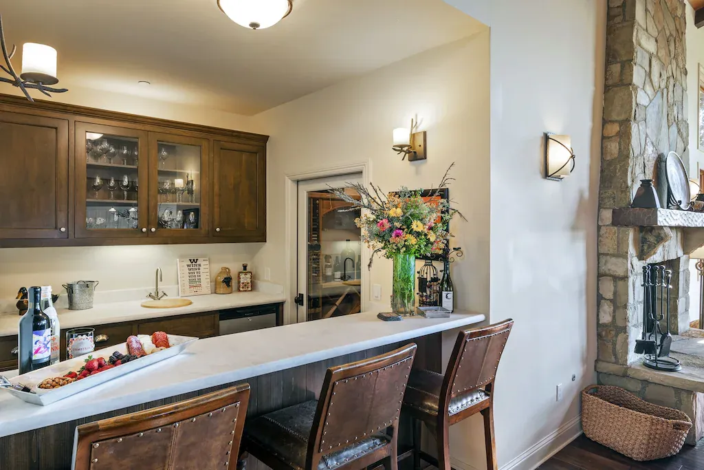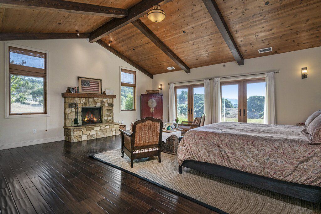 This newly built, spacious (5,618 square feet), custom craftsman home boasts quality! The residence features five over-sized bedrooms, each with floor-to-ceiling French doors opening onto private patios. Four of the bedrooms offer en suite bathrooms. The master suite features a private fireplace, patio and outdoor shower. The en suite master bathroom includes an over-sized walk-in shower, closet and bath tub. As you enter the main house, the dark walnut plank floors and cream-colored walls provide a perfect back drop for the beautiful windows and comfortable furnishings. The formal dining room accommodates 10 guests for a lavish dinner. The large stone fireplace and gorgeous wall sconces add warmth and elegance. Opposite the dining room, the living room has hand carved beams and comfortable seating where guests can enjoy a glowing fire or sit at the entertainer’s bar. The chef’s kitchen offers all Viking appliances, two dishwashers, as well as over-sized island.