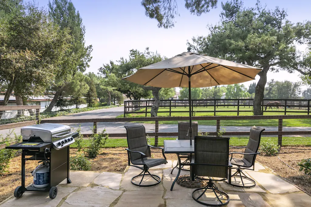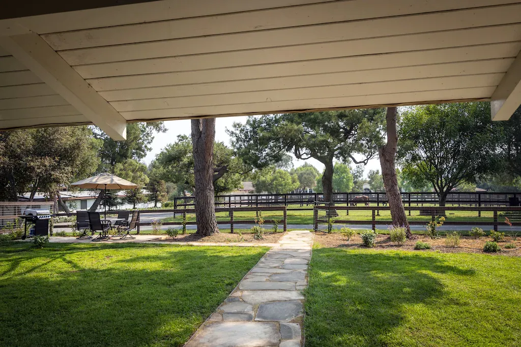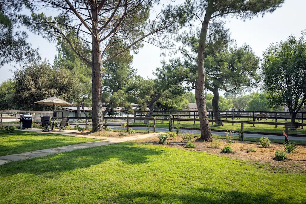 A private fenced in yard, surrounds Rancho Mora with trees and foliage. This yard is equipped with a barbecue and gathering spaces for you and your guests. Further beyond Rancho Mora's private area is the property's acreage where you are welcome to wander and discover the horses, ranch animals, pastures, and stables.