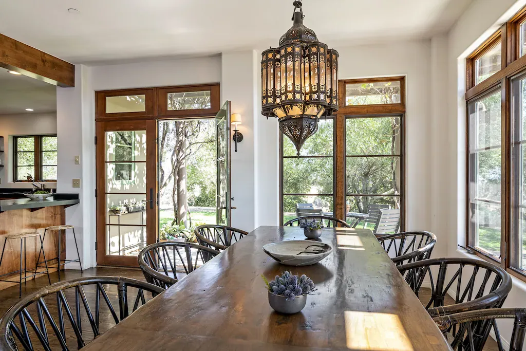 Rancho Maroma is a green home 50 percent powered by solar panels and uses eco-friendly paint. Its thick adobe plaster is an energy efficient material that absorbs energy from the sun and radiates through the home when the weather gets cool, and in warmer months the material helps hold the coolness in the home from the previous night.